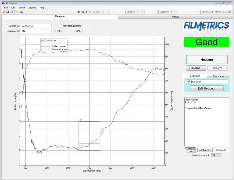 Filmetrics F10-RT薄膜厚度測量儀以真空鍍膜為設計目標,F(xiàn)10-RT薄膜厚度測量儀只要單擊鼠標即可獲得反射和透射光譜。 只需簡單操作。用戶就能進行 FWHM 并進行顏色分析。 可選的厚度和折射率模塊讓您能夠充分利用Filmetrics F10-RT薄膜厚度測量儀的分析能力。測量結(jié)果能被快速地導出和打印。