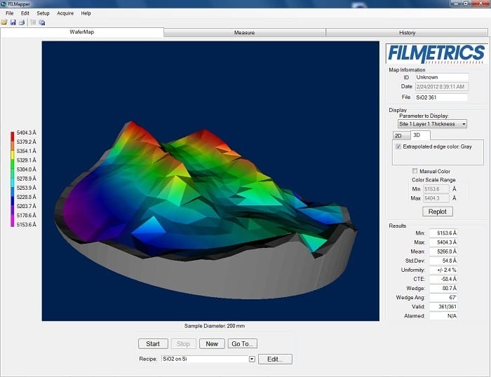 Filmetrics F54 白光干涉膜厚測量儀能以一個電動R-Theta平臺自動移動到選定的測量點以每秒測繪兩個點的速度快速的測繪薄膜厚度, 樣品直徑達450毫米,可選擇數(shù)十種內(nèi)建之同心圓,矩形,或線性圖案模式,或自行建立無數(shù)量限制之測量點.只需具備基本電腦技能,就可在數(shù)分鐘內(nèi)自行建立配方。